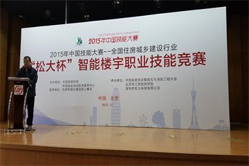 武晓萌副院长主持开幕式,北京市工贸技师学院轻工分院院长王剑白致欢迎词;大赛专家组组长寿大云教授代表大赛竞赛委员会作了讲话;深圳市松大科技有限公司董事长张彦礼代表承办单位作了讲话;中国就业培训技术指导中心技能竞赛处处长贾伟一代表人事部作了讲话;中国安装协会副会长兼秘书长杨存成代表主办作了讲话;住房和城乡建设部人事司副司长陈付宣布2015年中国技能大赛—全国住房城乡建设行业“松大杯”智能楼宇职业技能竞赛开赛!