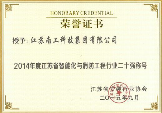 2015年12月18日,江苏省安装行业协会智能化与消防工程分会一届三次会员代表暨江苏省智能建筑高层论坛在南京召开。在本次会议上集团荣获江苏省安装行业协会颁发的《2014年江苏省智能化与消防工程行业二十强》称号。