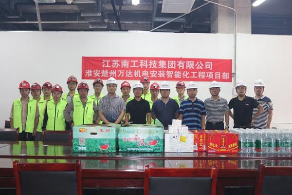 2019年7月29日,在集团执行董事陈俊桦、副总经理吴雪峰带领下,集团安全生产检查及慰问组前往淮安楚州万达机电安装智能化工程项目部,对项目进行了安全生产检查及慰问。并为项目部员工们送去了藿香正气液、西瓜、矿泉水、王老吉等防暑降温用品、药品。