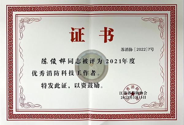 会议审议通过了协会年度工作报告、年度财务报告、协会“十四五”发展规划、协会六届理事会管理制度(办法)汇编,表决通过了协会六届理事会理事、常务理事、监事会监事增补议案。会议表彰了2021年度先进集体和个人,江苏太阳成集团tyc122cc入口科技集团有限公司执行董事陈俊桦被评为“优秀消防科技工作者”。