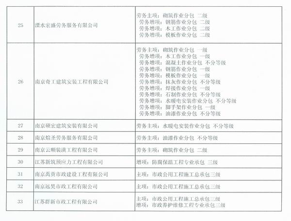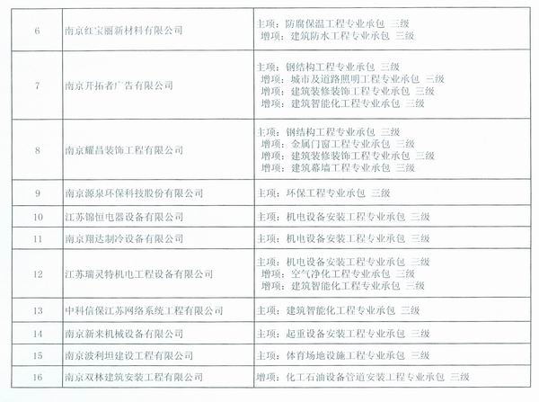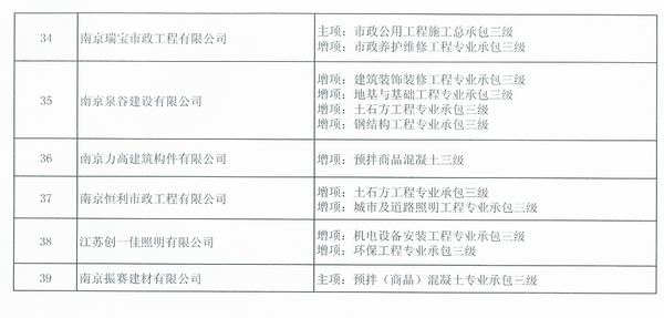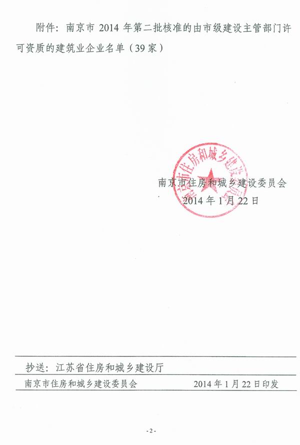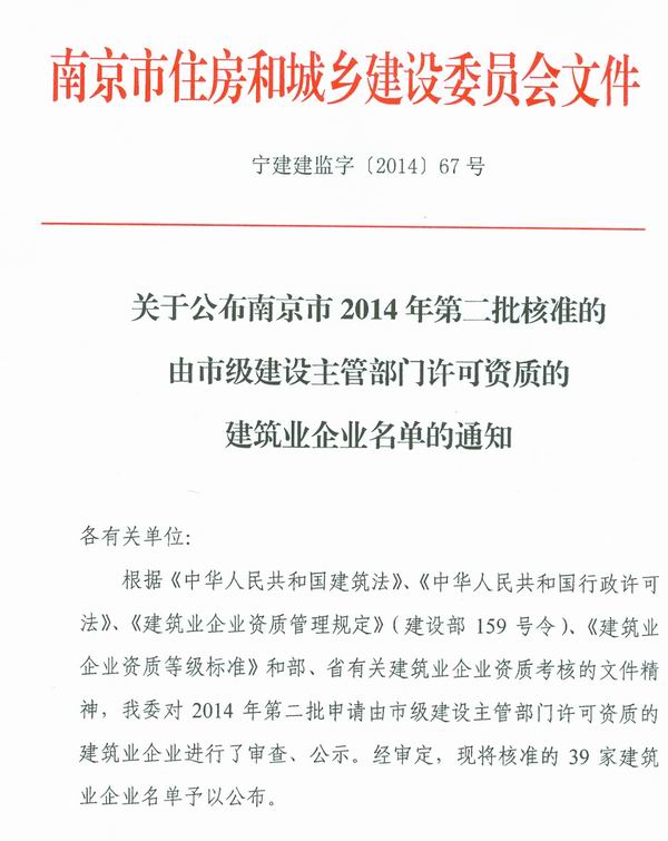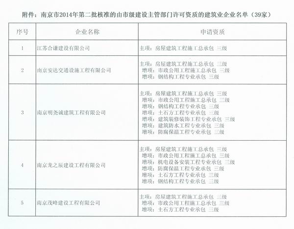 关于公布南京市2014年第二批核准的由市级建设主管部门许可资质的建筑业企业名单的通知