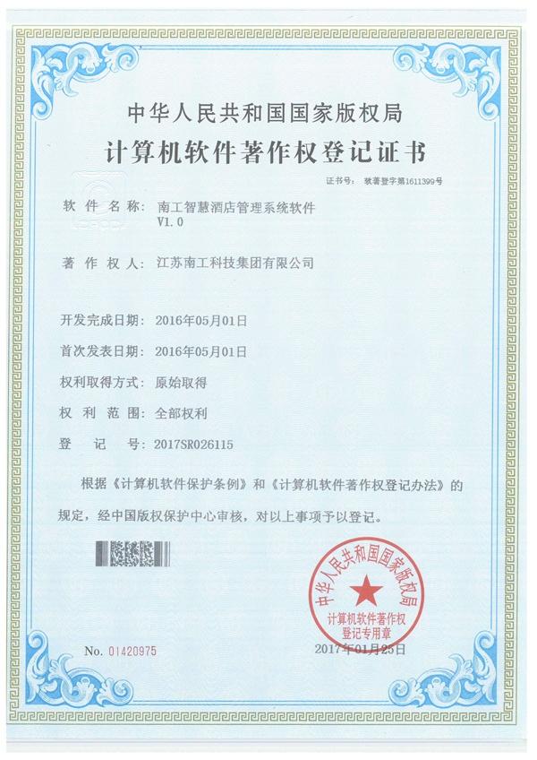 太阳成集团tyc122cc入口智慧酒店管理系统软件证书